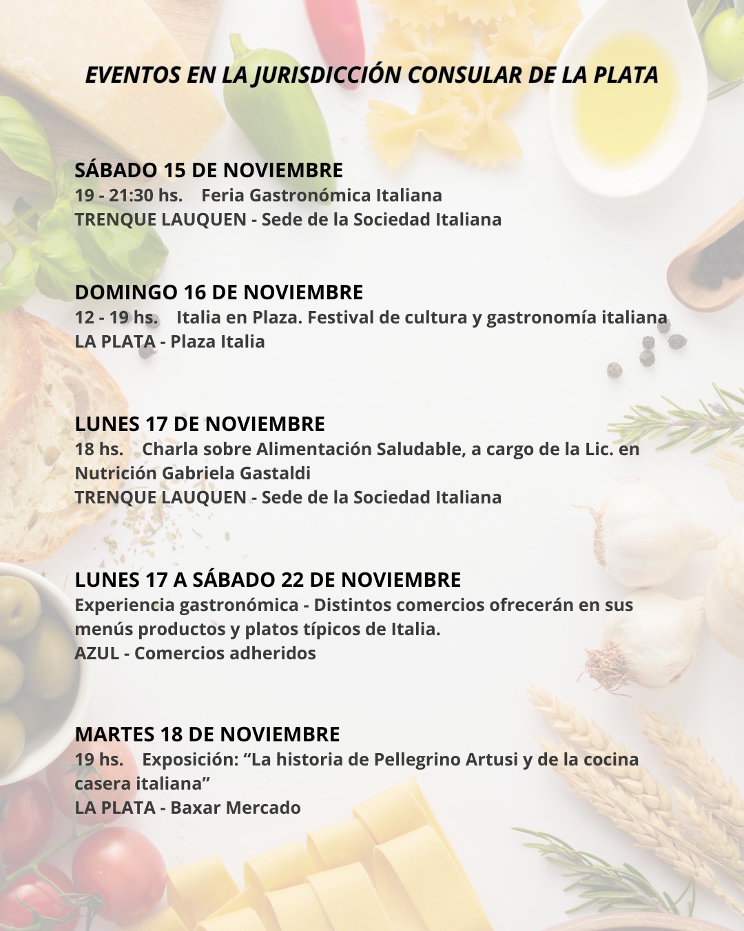 Del 15 al 21 de noviembre se celebró la X Semana de la cocina italiana en el mundo, que este año tuvo como tema central ‘La cocina italiana entre salud, cultura e innovación”. Una oportunidad única para descubrir la cocina italiana a través de un viaje por sus sabores, tradiciones y beneficios para la salud. Una serie de eventos organizado por el Consulado General de Italia en La Plata en colaboración con instituciones y asociaciones locales le dieron vida a esta semana que promueve y difunde la cultura gastronomica italiana en el mundo.